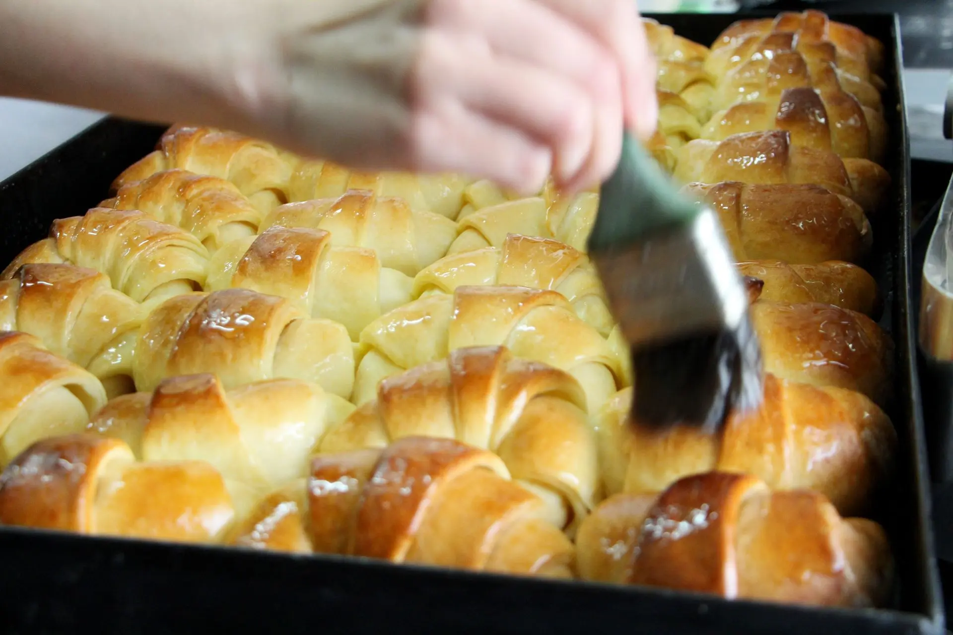 - Formado de medialunas: cortar triángulos y enrollar dando forma de medialuna. Colocarlas en una placa con 2 cm de separación, pincelar con huevo batido, tapar y dejar fermentar 1 hora en lugar cálido.